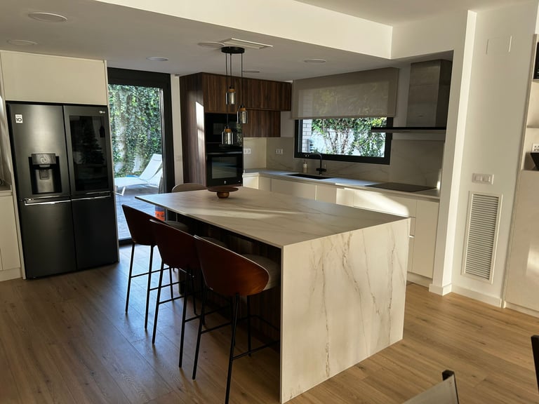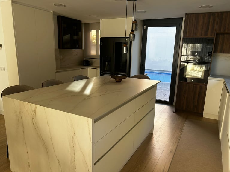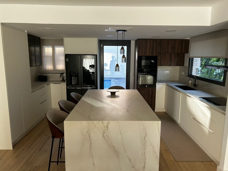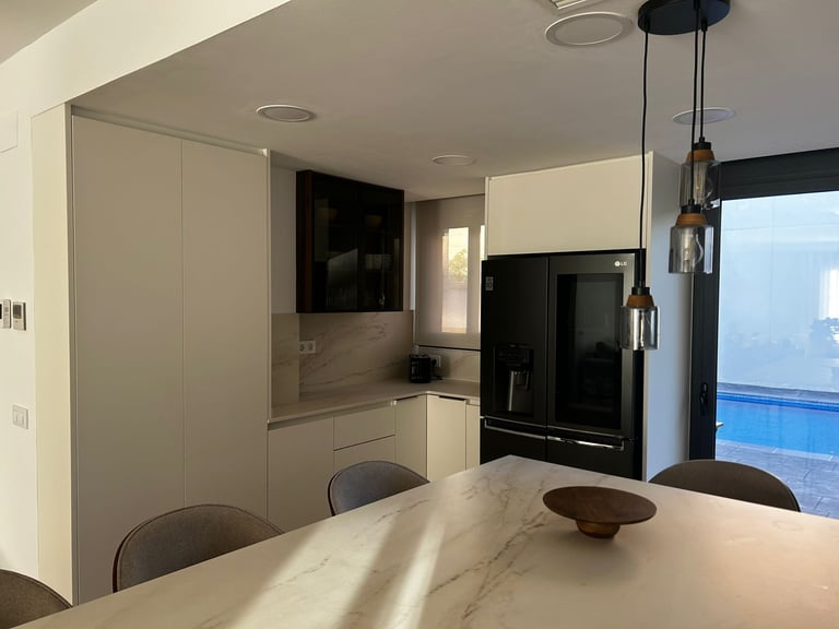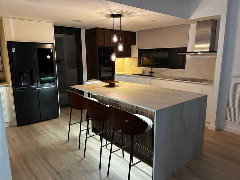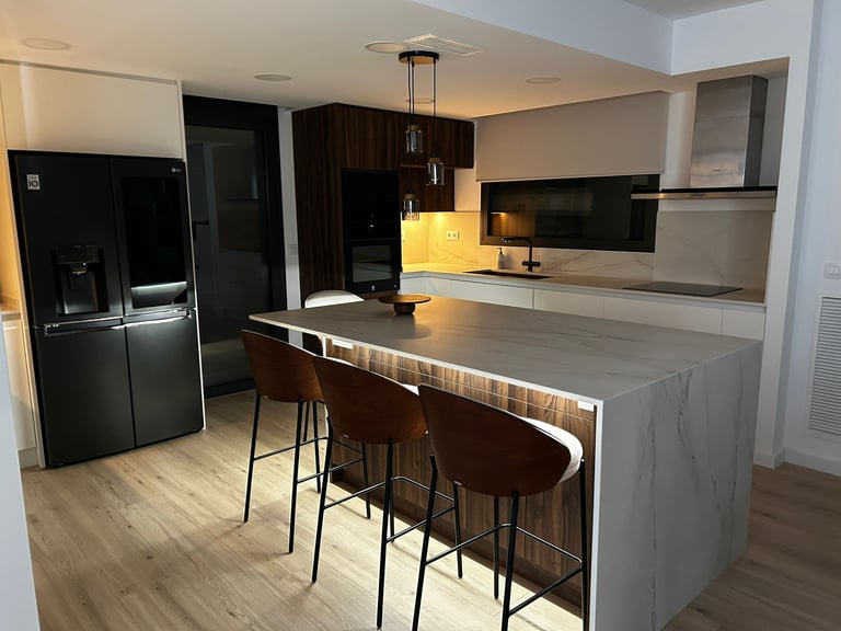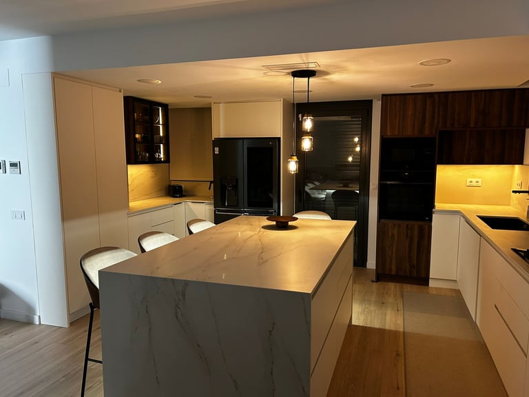 Una demostración de cómo la actualización de materiales y distribución, centrada en la funcionalidad y el almacenamiento, puede convertir la cocina en el corazón de tu hogar, mientras la luz ambiental transforma el espacio, creando un ambiente cálido y acogedor.